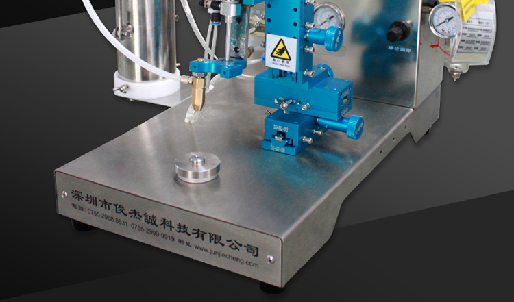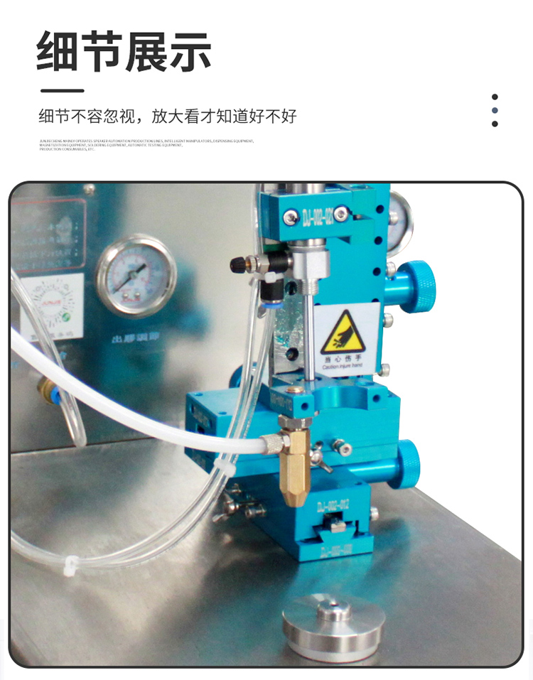 3.采用高速进口SMC电磁阀,微型精密调压阀,亚德客原装气缸,确保出胶精度;